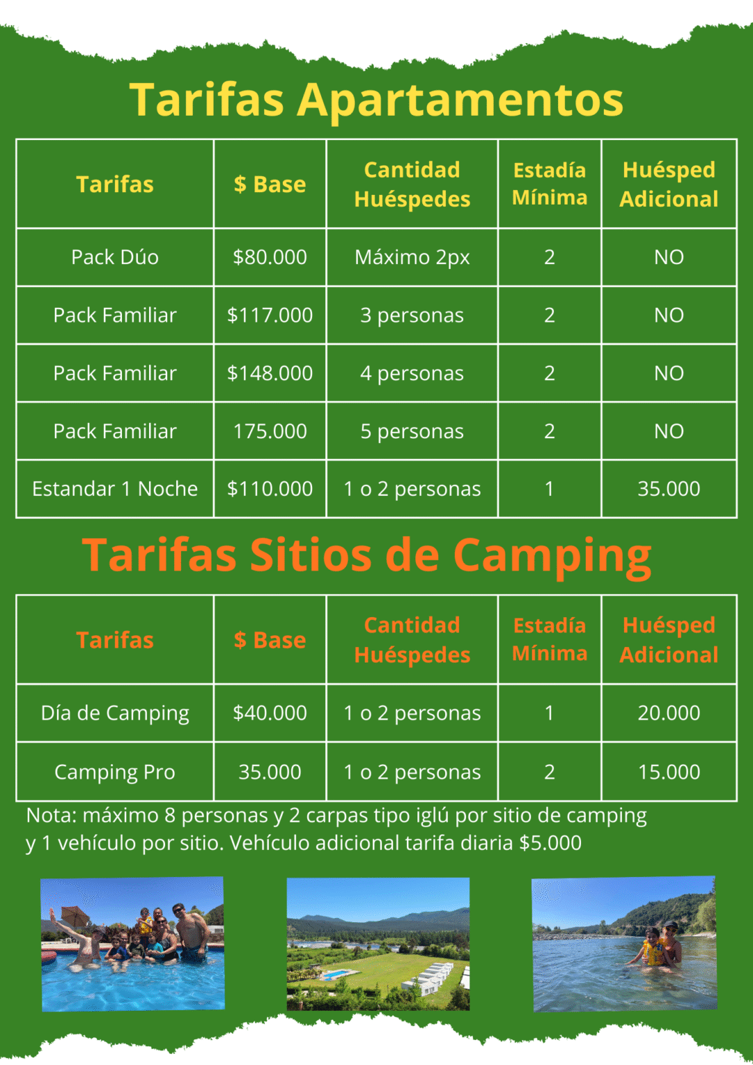 - Valor por persona/día: Adulto $ 15.000 – Niño/a $ 12.000